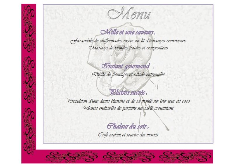 Une fois le menu choisi, j’ai eu envie d’en disposer un exemplaire sur chaque table. A un mariage, en tant qu’invité, il est toujours sympathique de découvrir ce que l’on va manger au moment de s’asseoir et d’avoir un truc à regarder, à triturer, à retourner. Hop, et on en fait profiter son voisin. Avec Monsieur, nous avons choisi un buffet froid. A partir de ce moment-là, mes oreilles n’ont eu de cesse d’être violentées par des « Vous n’avez pas besoin d’établir un quelconque menu vu qu’il s’agit d’un buffet ! Ca n’a pas vraiment de sens, croyez-en notre expérience et blablabla. » Buffet ou non, je ne voyais pas pourquoi je n’aurais pas droit à mon menu. Et pour corser le tout, je le voulais poétique et pourquoi pas sous forme de charade, de métaphores en veux-tu, en voilà ! Cela peut créer une activité autour de la table. On essaie de deviner ce qu’on va bien pouvoir déguster.